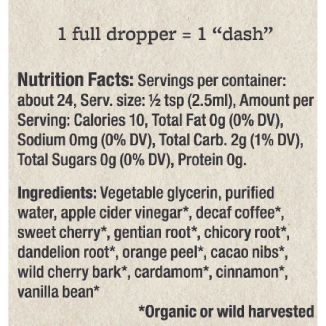 Ingredients: Vegetable glycerin, purified water, apple cider vinegar*, decaf coffee*, sweet cherry*, gentian root*, chicory root*, dandelion root*, orange peel*, cacao nibs*, wild cherry bark*, cardamom*, cinnamon*, vanilla bean* *Organic or wild harvested ingredients