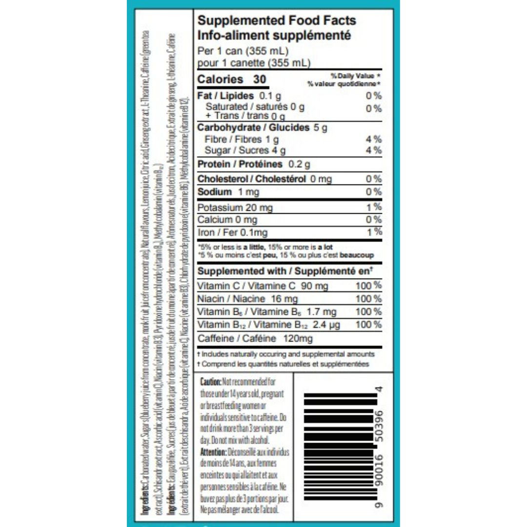 Ingredients: Carbonated water, sugars (blueberry juice from concentrate, monk fruit juice from concentrate), natural flavours, lemon juice, citric acid, ginseng extract, L-Theanine, caffeine (green tea extract), schisandra extract, ascorbic acid (vitamin C), niacin (vitamin B3), pyridoxine hydrochloride (vitamin B₆), methylcobalamin (vitamin B₁₂).