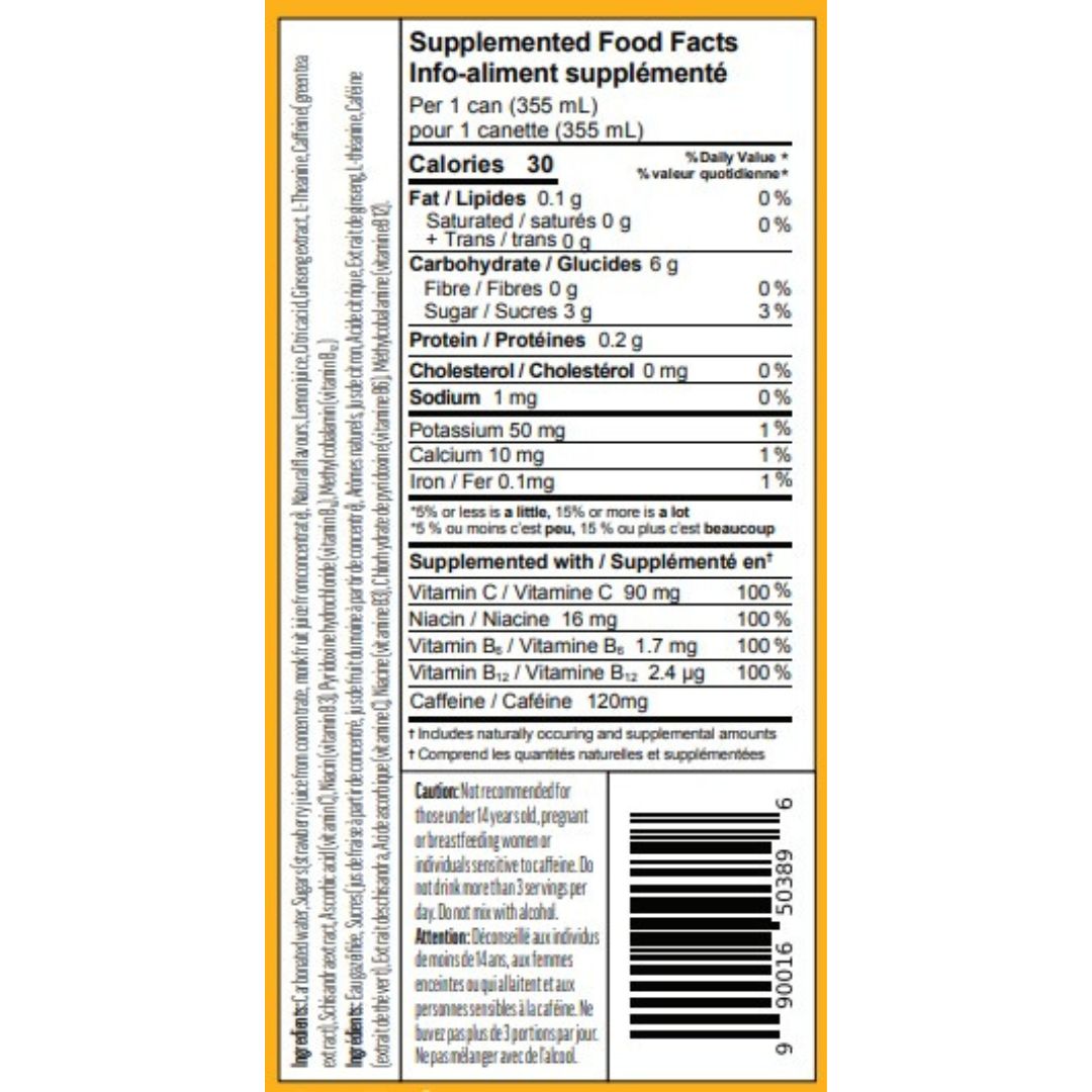 Ingredients: Carbonated water, sugars (strawberry juice from concentrate, monk fruit juice from concentrate), natural flavours, lemon juice, citric acid, ginseng extract, L-Theanine, caffeine (green tea extract), schisandra extract, ascorbic acid (vitamin C), niacin (vitamin B3), pyridoxine hydrochloride (vitamin B₆), methylcobalamin (vitamin B₁₂).