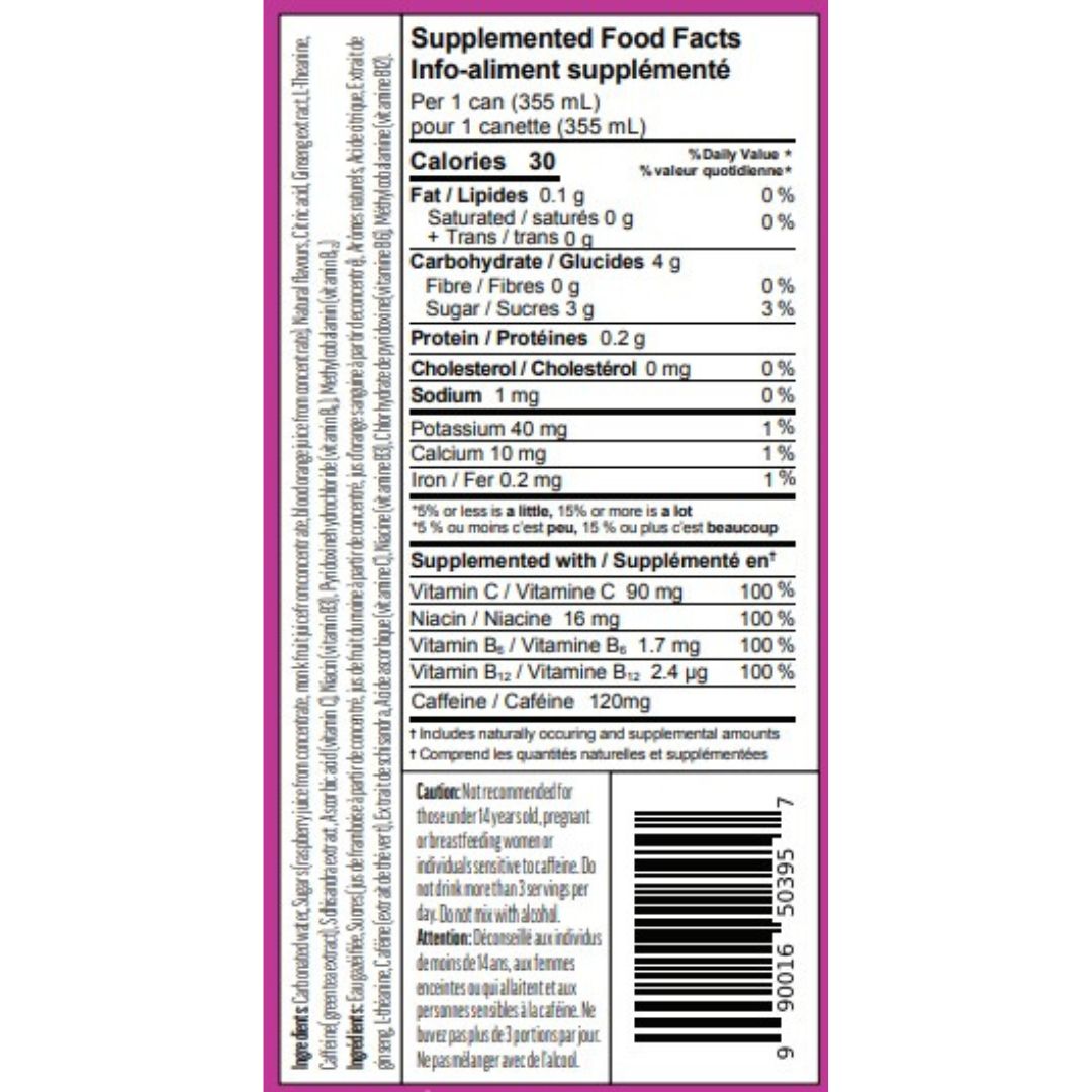 Ingredients: Carbonated water, sugars (Raspberry Juice from concentrate, monk fruit Juice from concentrate, blood orange juice from concentrate), natural flavours, citric acid, ginseng extract, L-Theanine, caffeine (green tea extract), schisandra extract, ascorbic acid (vitamin C), niacin (vitamin B3), pyridoxine hydrochloride (vitamin B₆), methylcobalamin (vitamin B₁₂).