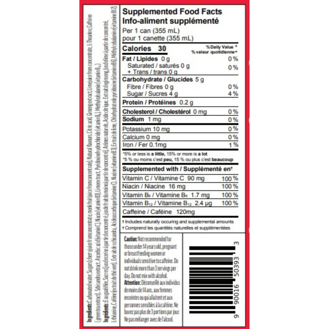 Ingredients:Carbonated water, sugars (Cherry juice from concentrate, monk fruit juice from concentrate), natural flavours, citric acid, ginseng extract, lime juice from concentrate, L-Theanine, caffeine (green tea extract), schisandra Extract, ascorbic acid (vitamin C), niacin (vitamin B3), lime extract, pyridoxine hydrochloride (vitamin B₆), methylcobalamin (vitamin B₁₂).