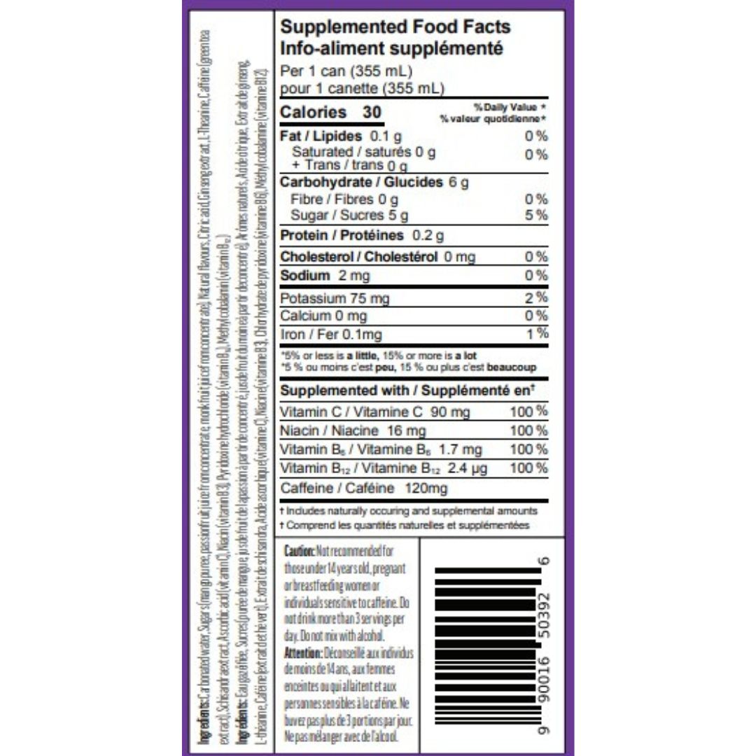 Ingredients: Carbonated water, sugars (mango puree, passionfruit juice from concentrate, monk fruit juice from concentrate), natural flavours, citric acid, ginseng extract, L-Theanine, caffeine (green tea extract), schisandra extract, ascorbic acid (vitamin C), niacin (vitamin B3), pyridoxine hydrochloride (vitamin B₆), methylcobalamin (vitamin B₁₂).