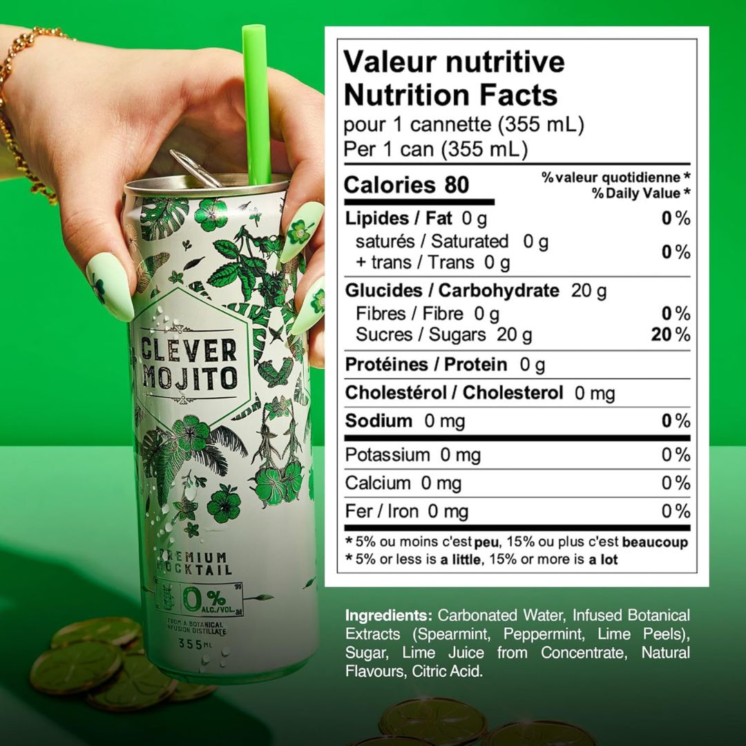 Ingredients: Carbonated water, infused botanical extracts(spearmint, peppermint, lime peels), Sugar, lime juice, natural flavours, citric acid