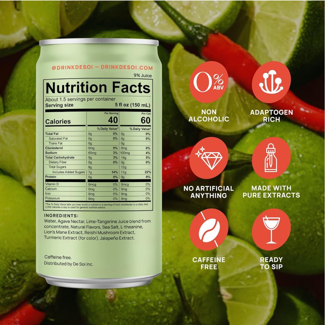 Ingredients: Water, Agave Nectar, Lime-Tangerine juice blend from concentrate, Natural Flavors, Sea Salt, L-Theanine, Lion's Mane Extract, Reishi Mushroom Extract, Turmeric Extract (for color), Jalapeno extract.