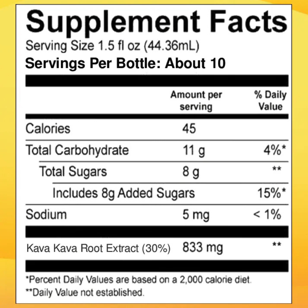 Ingredients: Filtered Water, Organic Ginger Juice, Organic Cane Sugar, Noble Kava Root Extract, Organic and Natural Flavors, Citric Acid, Organic Acacia Gum, Gellan Gum, Organic Vegetable Yellow Color, Organic Stevia Leaf Extract.