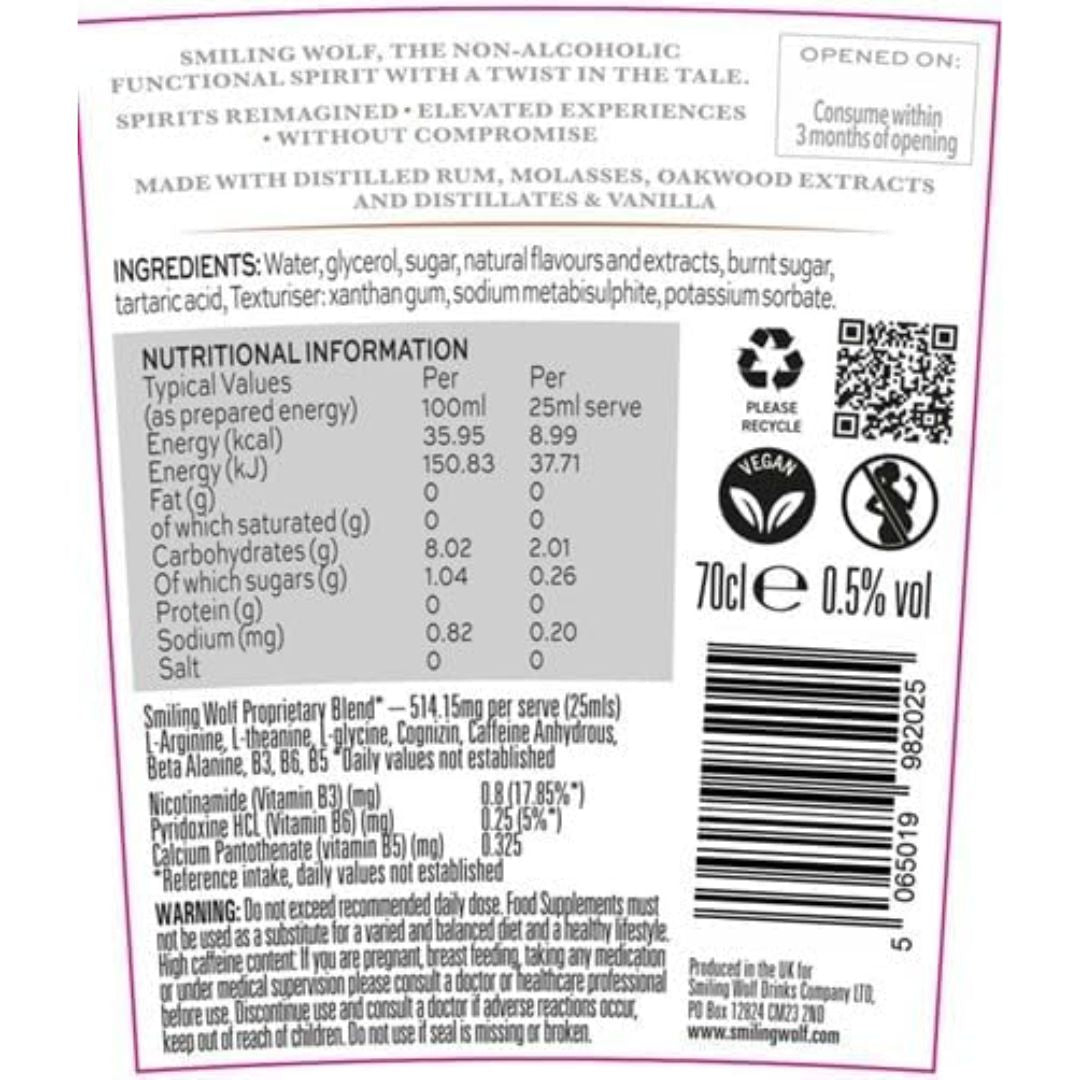 Ingredients: Water, glycerol, sugar, natural flavours and extracts (oakwood, vanilla), rum, burnt sugar, Smiling Wolf Proprietary Blend (L-Arginine, L-theanine, L-glycine, Caffeine Anhydrous, Beta Alanine, B3, B6, B5), tartaric acid, Texturiser: xanthan gum, sodium metabisulphite, potassium sorbate.