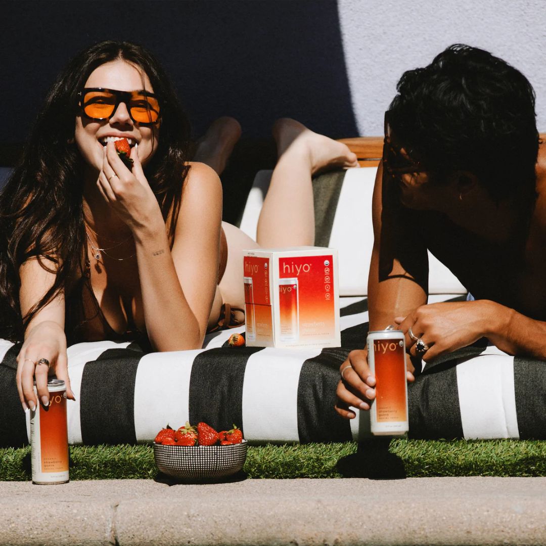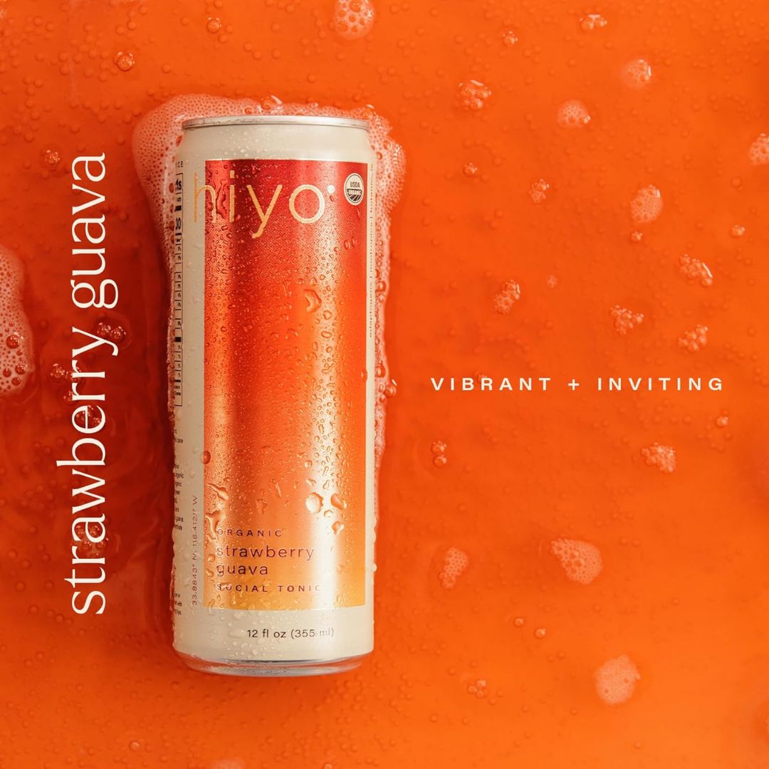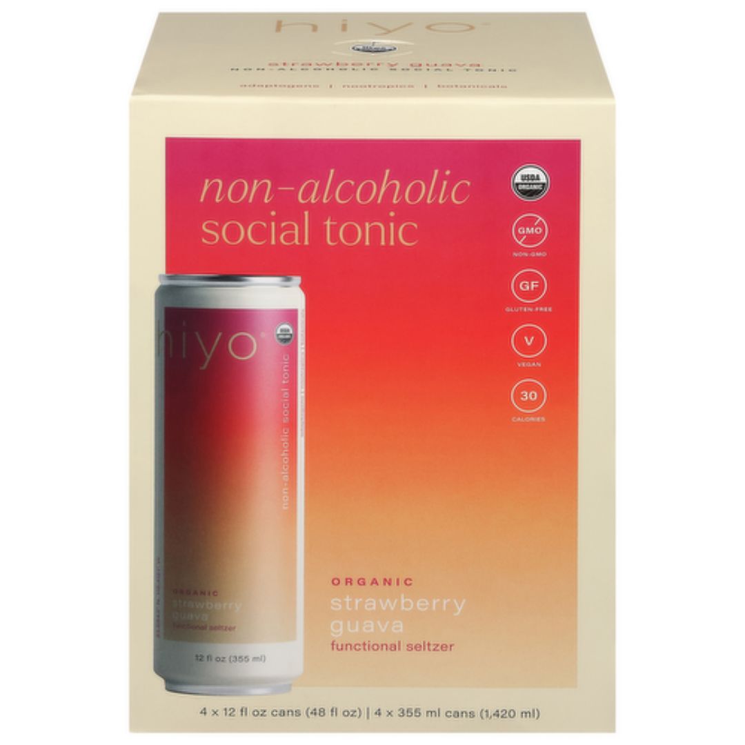 The non-alcoholic Hiyo - Strawberry Guava seltzer is bright, tangy, and just plain beautiful. the taste of ripe strawberries blends with the exotic essence of guava, gliding down the hatch like a sunset to the sea. crafted with organic adaptogens, natural nootropics, and functional botanicals, hiyo provides a stress-relieving, mood-boosting lift we like to call "the float."