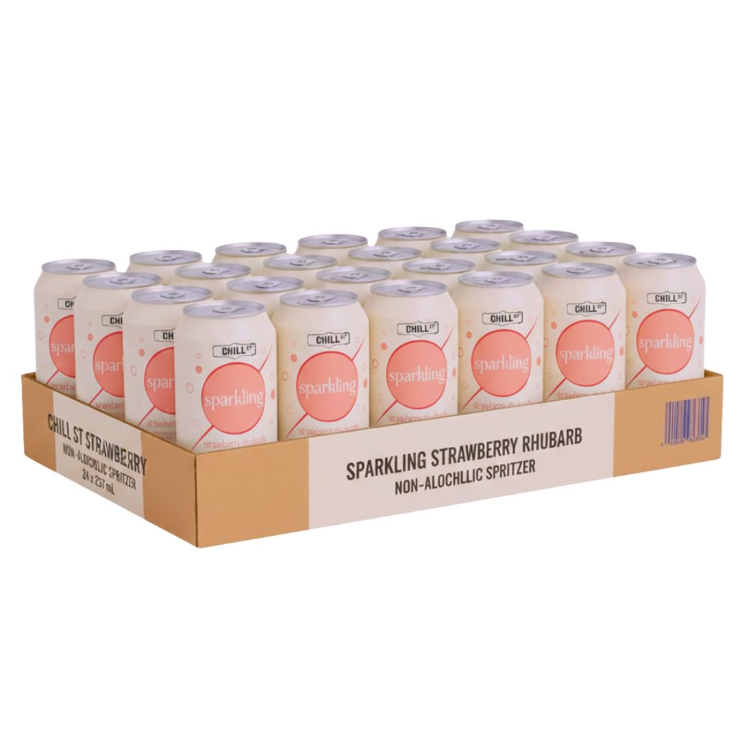 Savor the taste of summer with the delightful Chill Street Strawberry Rhubarb Wine-Style Spritzer (Non-Alcoholic)! This ready-to-drink mocktail captures the essence of a light, fruity wine spritzer, beautifully infused with the perfect balance of sweet strawberries and tart rhubarb, all without the alcohol.