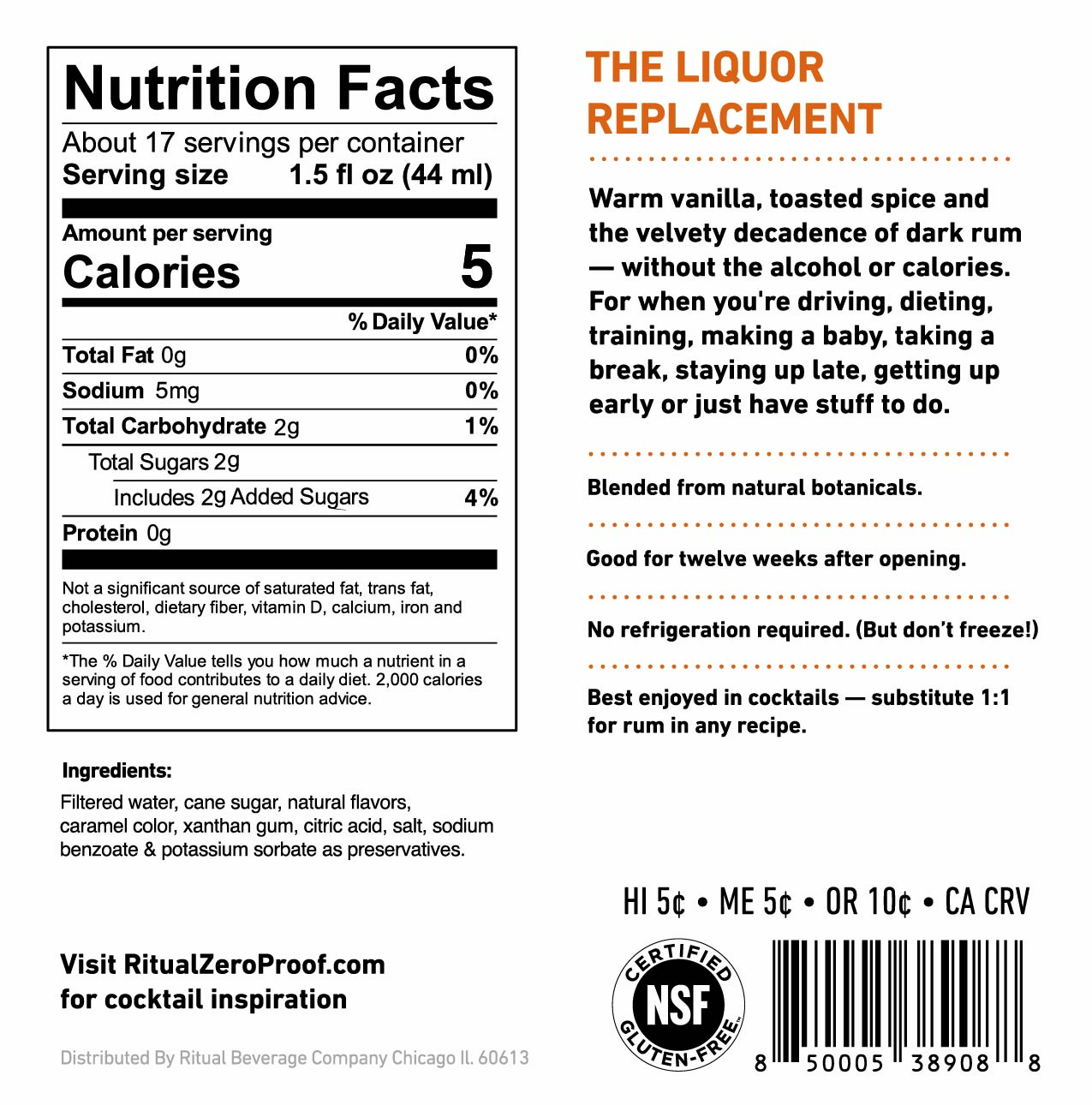 Experience the rich, warm flavors of dark rum without the alcohol or calories with Ritual Zero Proof Rum. Perfect for crafting non-alcoholic versions of your favorite cocktails like mojitos and mai tais, or simply enjoying with soda or juice. Indulge in the velvety decadence of vanilla, toasted spice, and lush notes of ripe banana and burnt orange, complemented by cloves and star anise.