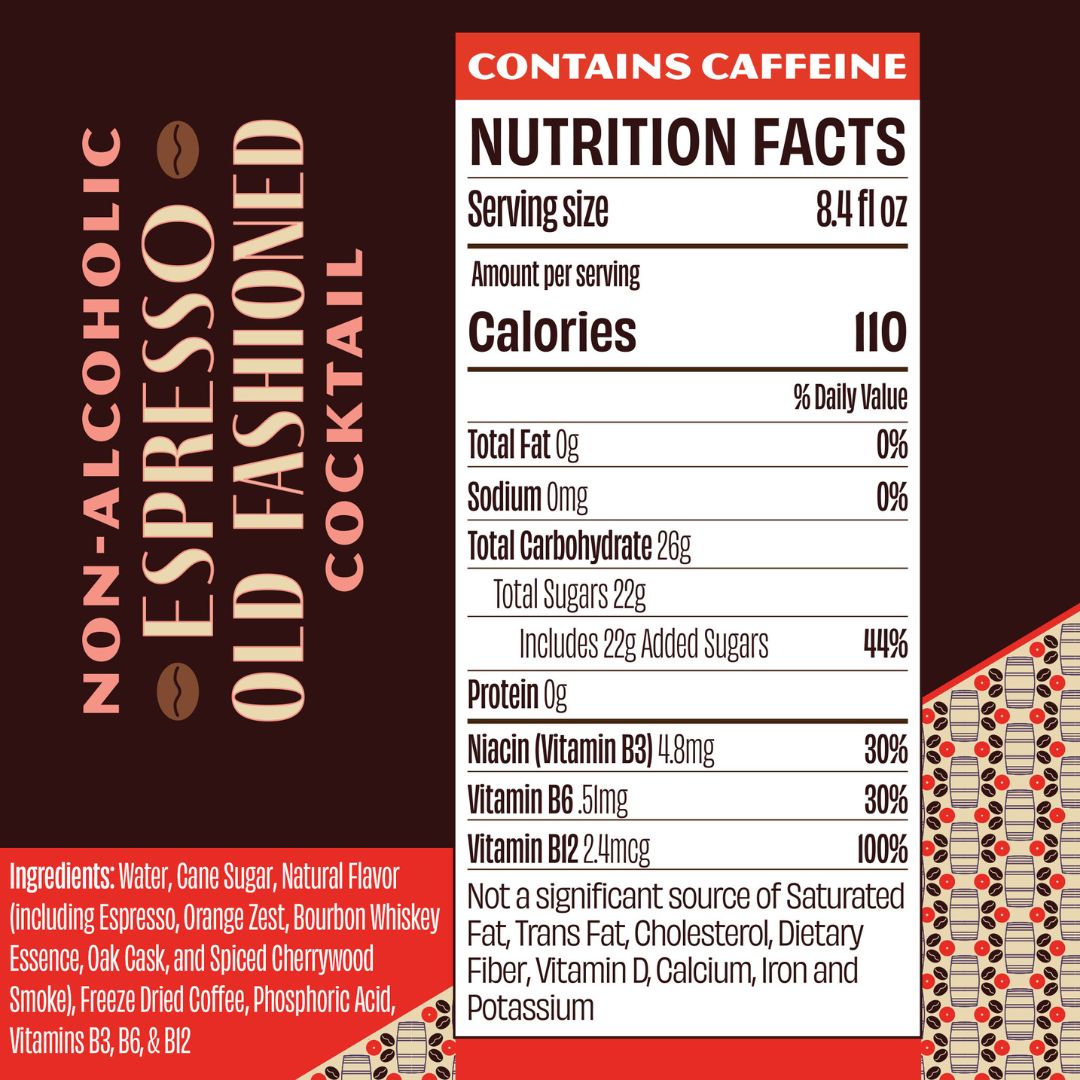 Ingredients: Water, cane sugar, natural flavor (including espresso, orange zest, bourbon whiskey essence, oak cask, and spiced cherrywood smoke), freeze dried coffee, phosphoric acid, vitamins B3, B6, & B12. Caffeine level: 64mg (equal to about 1 oz of espresso)