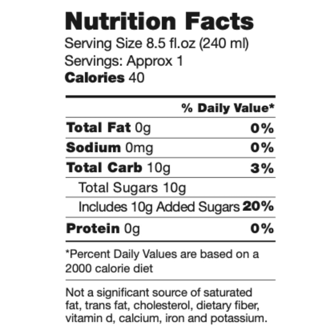 Ingredients: Carbonated Water, Cane Sugar, White Tea, White Cranberry Concentrate, Elderberry Concentrate, Natural Ginger Extract, Natural Citrus Extract with other Natural Flavors, Citric Acid.