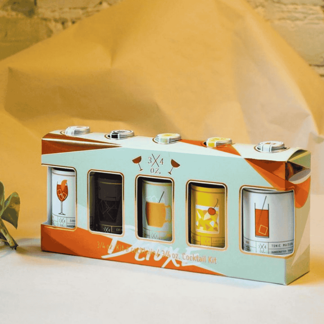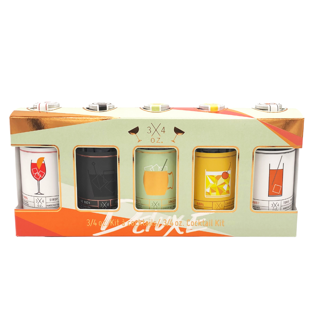 3/4 oz Deluxe Cocktail Kit contains artisanal syrups to make several classic cocktails including: Gin & Tonic, Rum & Coke, Moscow Mule, Margaritas, and Spritz.