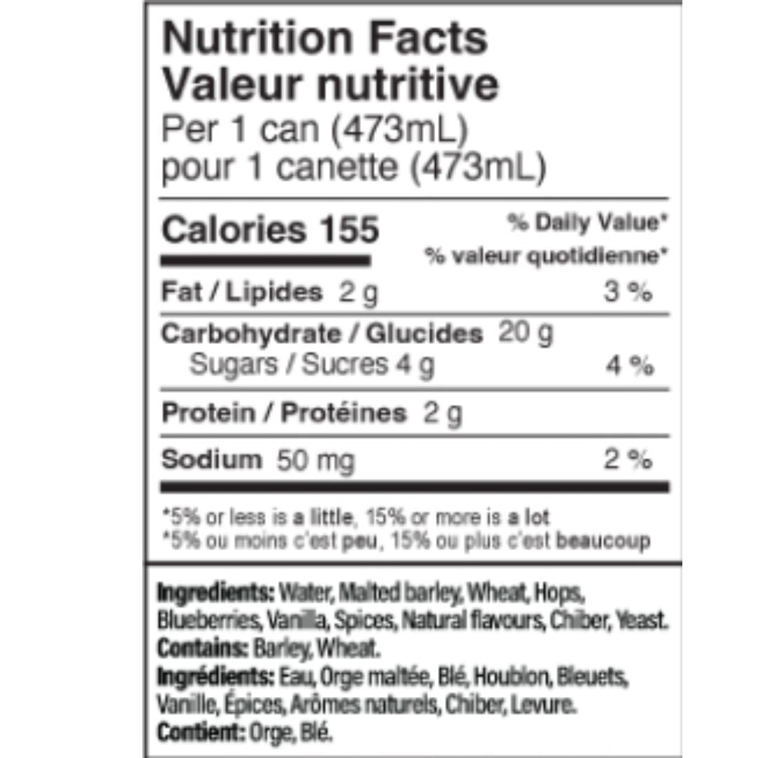 Ingredients: Water, malted barley, wheat, hops, blueberries, vanilla, spices, natural flavours, chiber, yeast.
