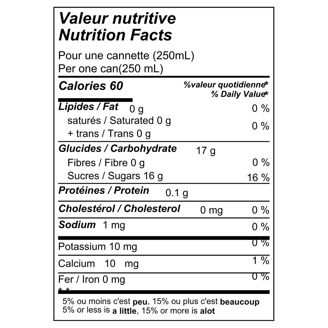 Ingredients: Water, organic cane sugar, concord grape juice from concentrate, sour cherry juice from concentrate, black tea, lemon juice from concentrate, lime juice from concentrate, sumac, black pepper, all spice, myrica gale, tartaric acid, potassium sorbate.