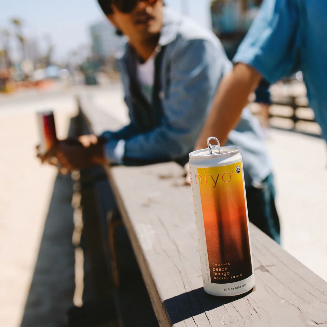 The non-alcoholic Hiyo - Peach Mango seltzer is a bright blend that encourages you to enjoy the moment. sweet peach twists with smooth mango to create a tropical tango so delightful, you can almost feel the trade winds blow. crafted with organic adaptogens, natural nootropics, and functional botanicals, hiyo provides a stress-relieving, mood-boosting lift we like to call "the float."