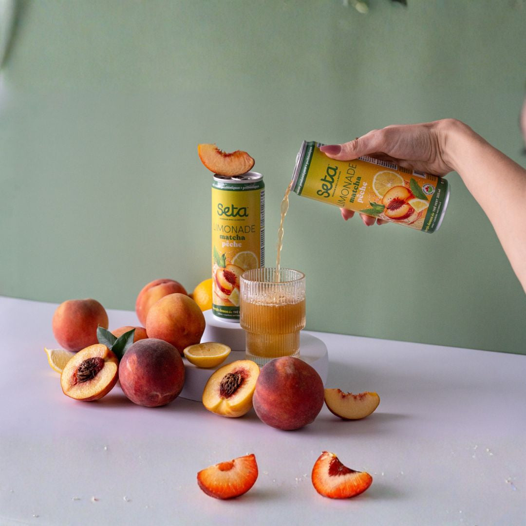 Seta Matcha Lemonade – Peach is a refreshing fusion of organic Japanese matcha and the sweetness of ripe peaches. With 50mg of natural caffeine from green tea, this plant-based drink delivers a gentle boost of energy. Infused with 1 billion CFU vegan probiotics and 3g of prebiotic fiber, it’s designed to support a healthy gut. With only 8g of sugar per can and no stevia, it’s the perfect balance of flavor and wellness.
